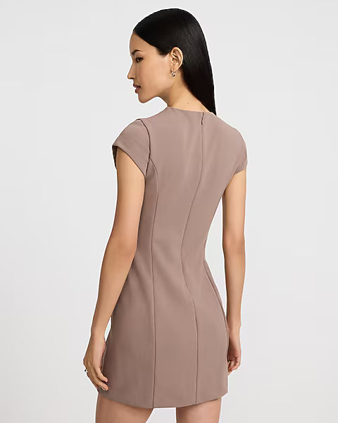 Crafted from a thick and comfortable crepe fabric, this mini dress features a crew neck line, cap sleeves, and seam details. Plus, it features a back zipper closure for easy wear.