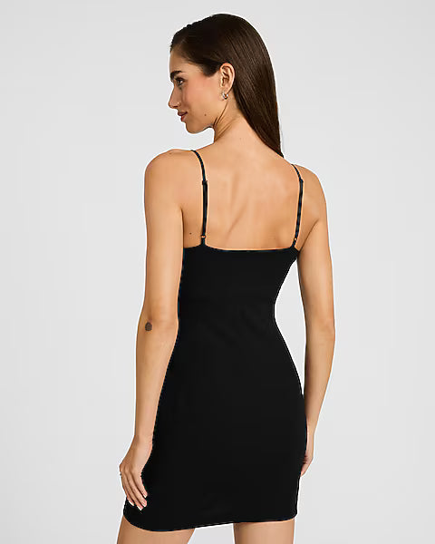 A crisp crepe fabric lends itself to this timeless mini dress complete with a scoop neckline and adjustable spaghetti straps.