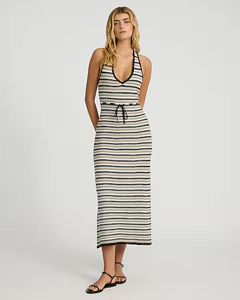 A chic striped crochet sweater dress complete with a flattering halter v-neckline, an open back, and a drawstring waist.