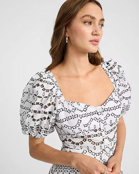A chic geo eyelet maxi dress crafted from breathable cotton. This tiered style features puff sleeves, a sweetheart neckline, and a button front.