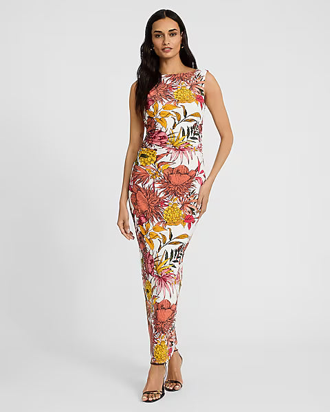 A fitted sleeveless maxi dress complete with a low twist back detail, a bold floral print, and a boat neckline.