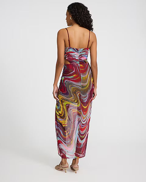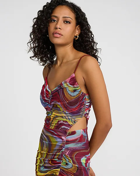 Printed Mesh V-Neck Cutout Open Back Ruched Maxi Dress