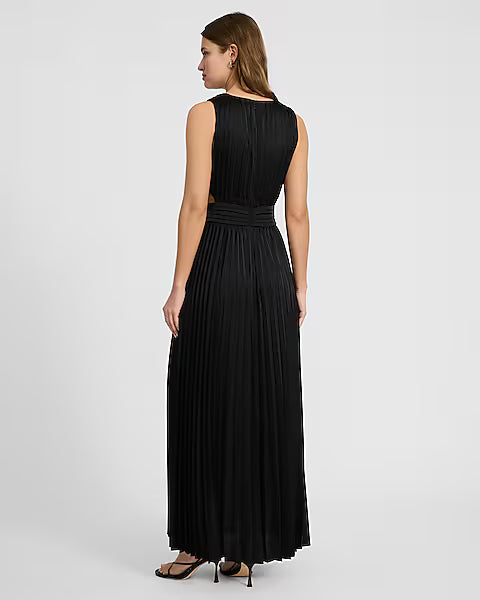 Satin Pleated V-Neck Sleeveless Cutout Maxi Dress